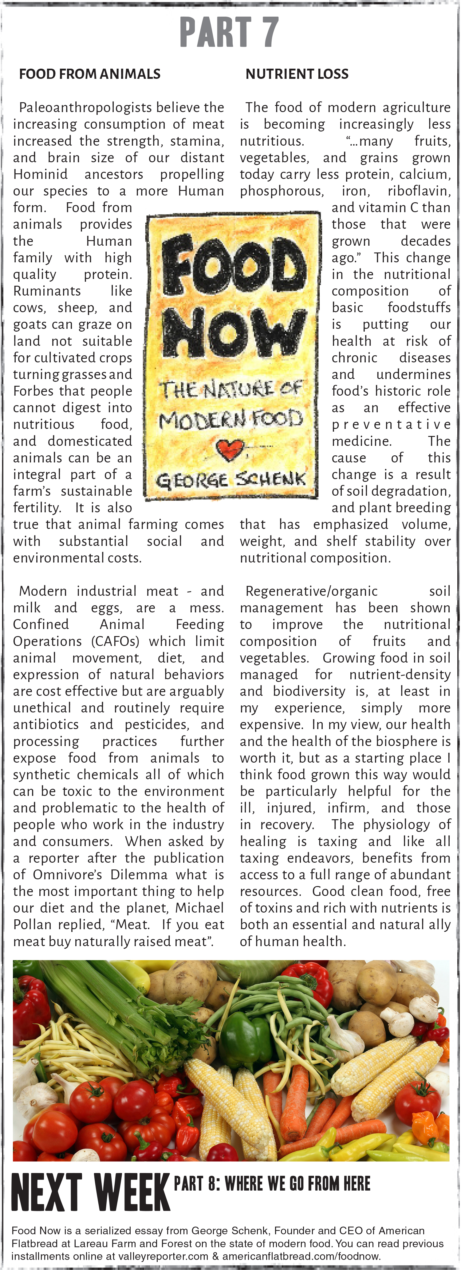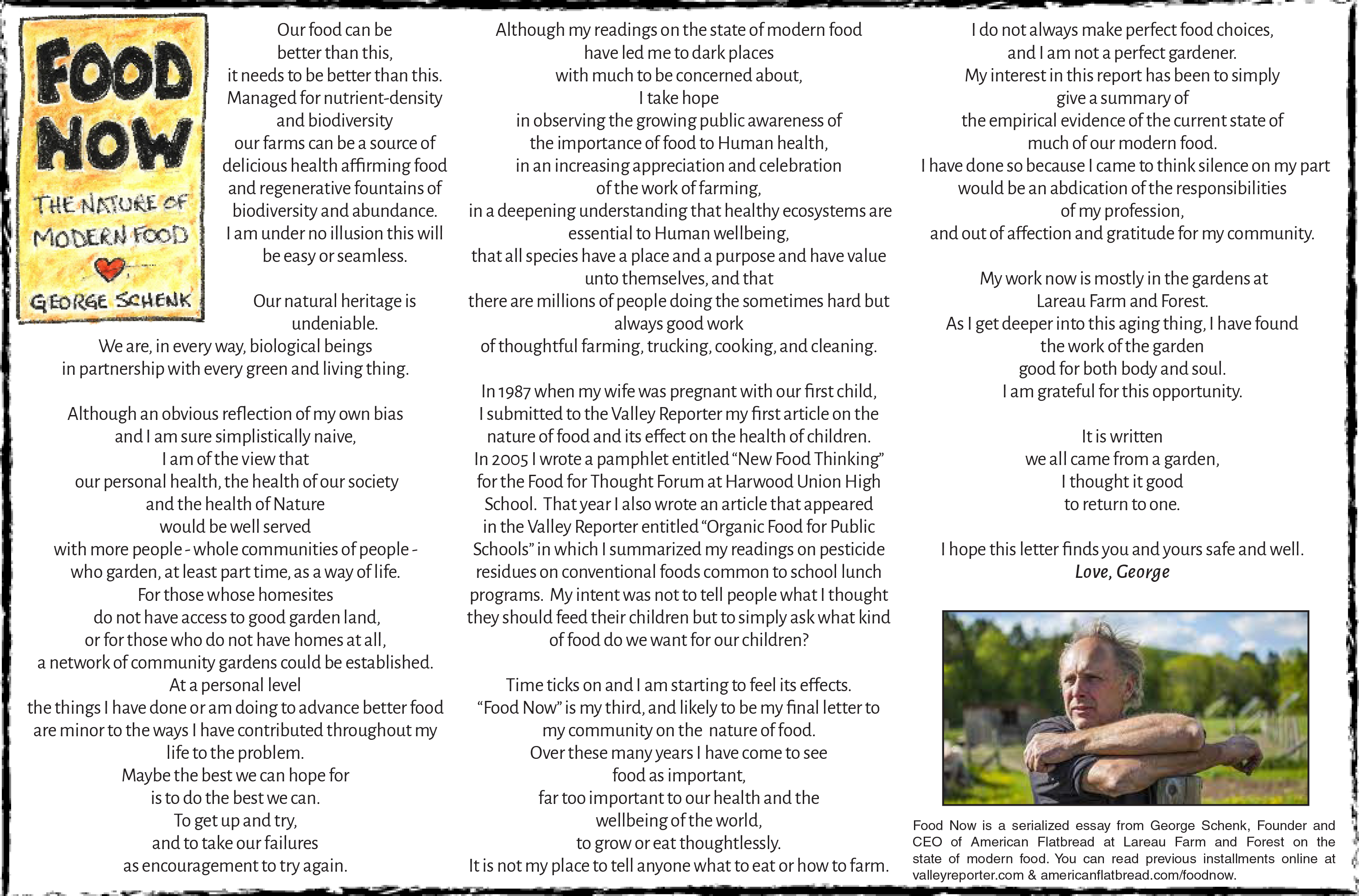 Food Now is a serialized essay from George Schenk, Founder and CEO of American Flatbread at Lareau Farm and Forest on the state of modern food.
