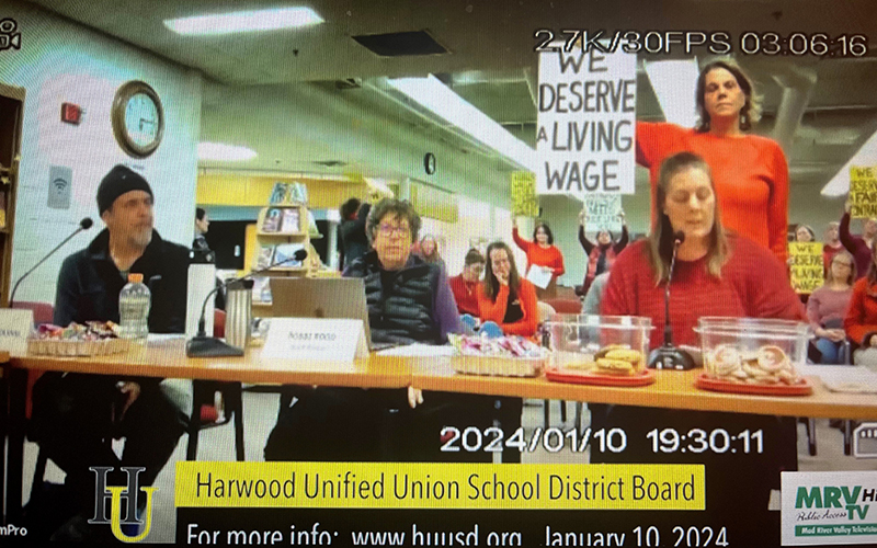 Support staff addressed the HUUSD Board in the public comment portion of their January 10 meeting. As they spoke, others stood behind them holding up signs. One read: “We have families, bills and needs – just like you.”
