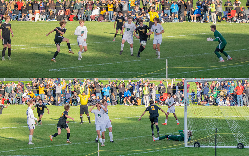 Gray skies that had been hanging over the field all day eased and some rays of sun soaked the field and spectators as Harwood pushed and pushed but kept finding the Rice defense up for the challenge. Then at the 99-minute mark Harwood won a corner. Junior Jack Greenwood took the kick sending it to the far side of the box where Nelson brought it down then with a flick changed direction back toward the goal and lofted a pass forward to where Scharf was standing surrounded by Rice defenders. As he had done many times during the season Scharf got a bead on the ball and volleyed it out of the air and with the twist of his hips redirected the ball past the Rice keeper and into the back of the net.